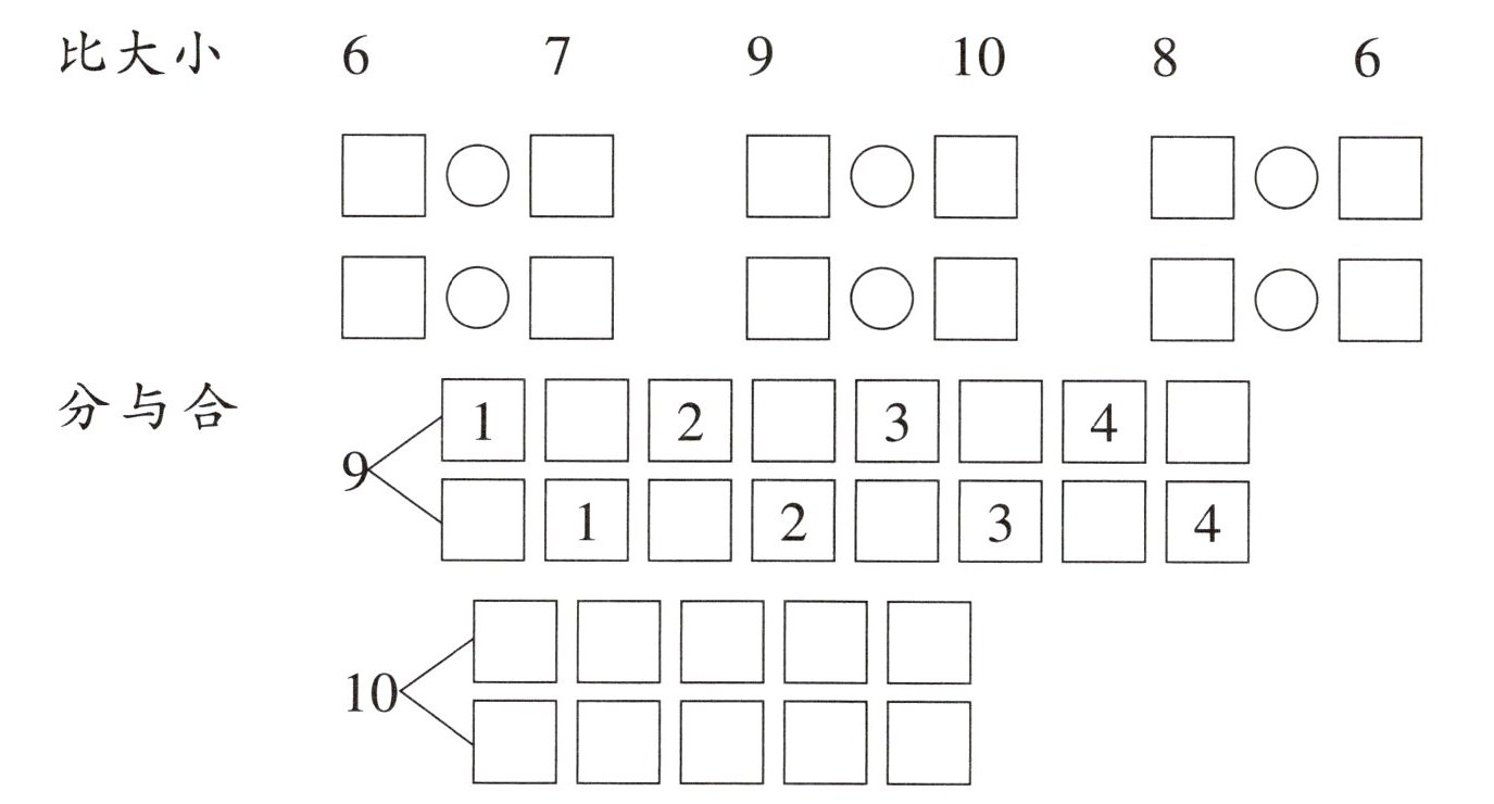 比大小:6<7,7<9,9<10,10>8,8>6,6=6;分与合(9):上1、8、2、7、3、6、4、5,下8、1、7、2、6、3、5、4;分与合(10):上1、2、3、4、5,下9、8、7、6、5;加减法:5,4,4,9,7,4,9,7