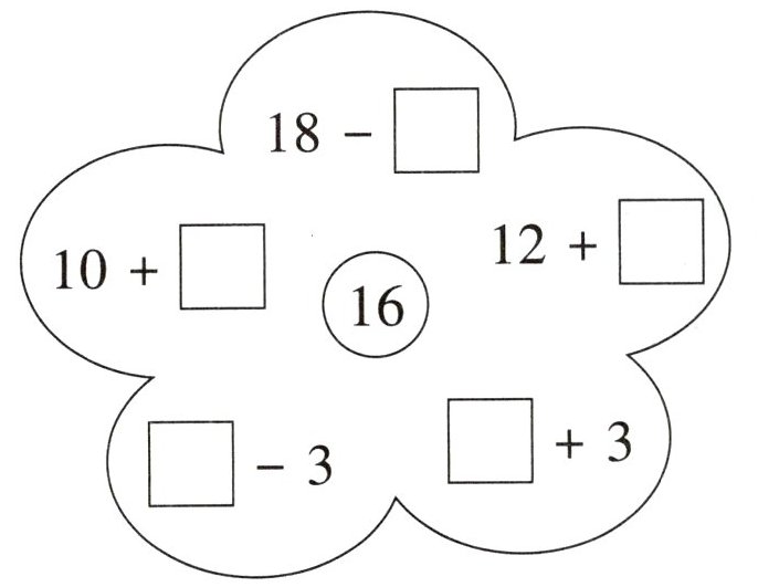 四、在$□$里填上合适的数,使花瓣上算式的得数和花中圆圈里的数相等。