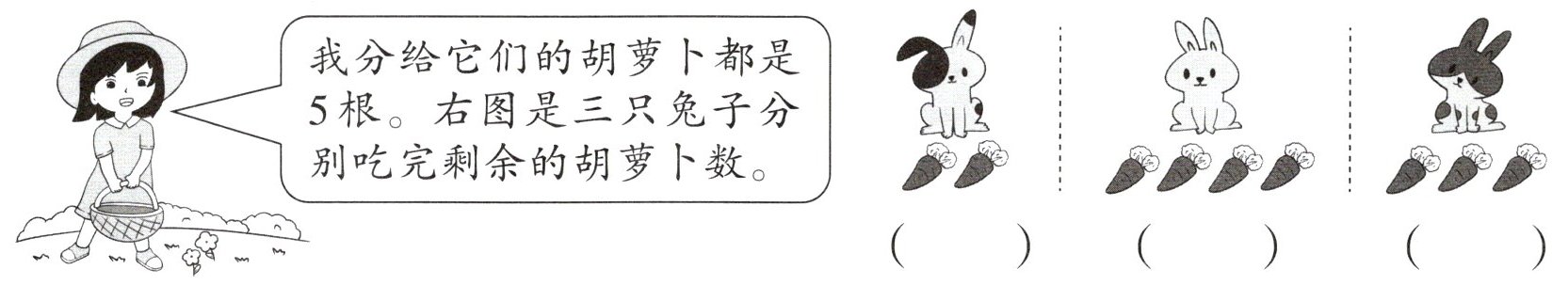 我分给它们的胡萝卜都是5根。右图是三只兔子分别吃完剩余的胡萝卜数。