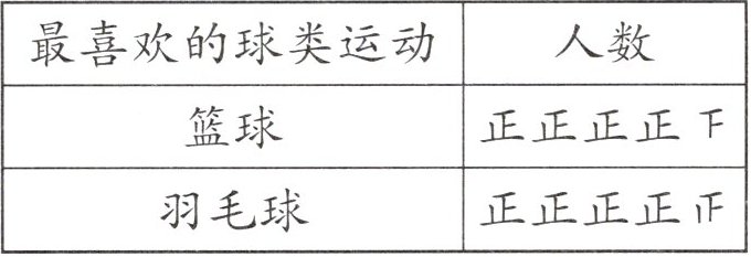 四、下表统计的是二(1)班同学最喜欢的球类运动情况(一画表示1个人,一个“正”字表示5个人)。最喜欢打篮球的有几人?最喜欢打羽毛球的有几人?