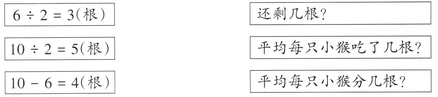 6÷2=3(根) 还剩几根?10÷2=5(根) 平均每只小猴吃了几根?10-6=4(根) 平均每只小猴分几根?