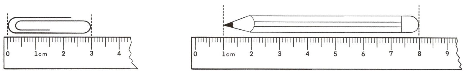 1. 一根手指的宽度、一块橡皮的高度等。2. 将铅笔的一端与直尺的刻度0对齐,看铅笔的另一端对着刻度几,读出长度。