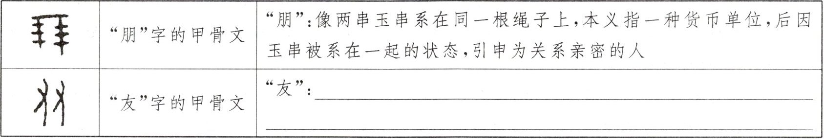 2. 小文查找了“朋友”二字的甲骨文,请你仿照表格中“朋”字的字源解说,对“友”字做字源解说。