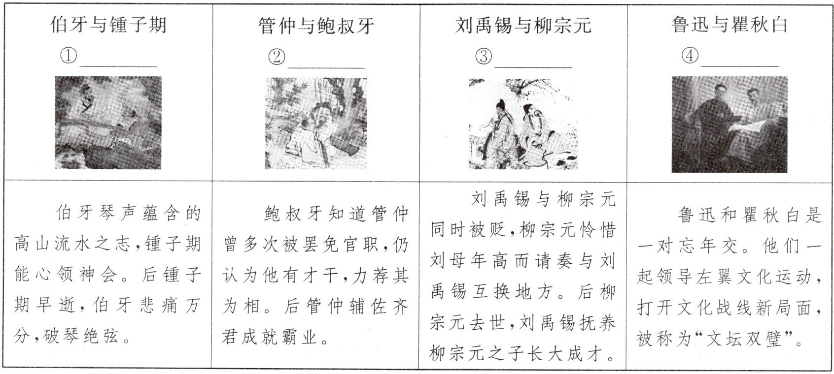 3. 小华搜集了下面的图片和故事,请你根据内容,选择恰当的主题词填人横线处,从而感受交友之道。