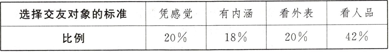 【示例】近半数中学生交友时看重对方人品。(或中学生交友时看对方是否有内涵的人数占比最少。)