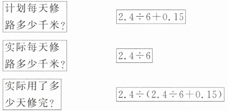 计划每天修路多少千米?连2.4÷6;实际每天修路多少千米?连2.4÷6+0.15;实际用了多少天修完?连2.4÷(2.4÷6+0.15)