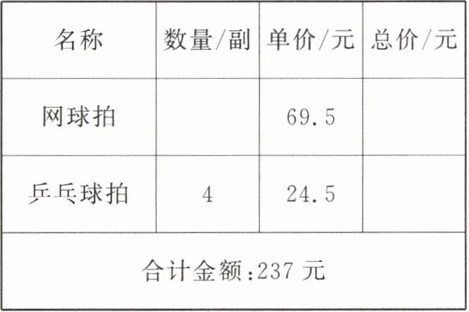 名称:网球拍,数量/副:2,单价/元:69.5,总价/元:139;名称:乒乓球拍,数量/副:4,单价/元:24.5,总价/元:98;合计金额:237元。
