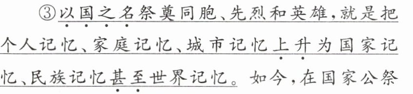 “以国之名”这个词语庄重而有力,强调了公祭活动的权威性和国家层面的重视,体现了国家对历史事件的深刻反思和对死难者的高度尊重,增强了句子的严肃性。“上升”“甚至”这两个词语说明公祭活动的影响力已从个人、家庭、城市逐步扩展到国家、民族乃至世界,突出了公祭活动的深远意义,表明南京大屠杀的历史不仅是局部事件,更是全人类要共同铭记的教训,呼吁全人类共同铭记历史、珍爱和平,增强了句子的感染力和号召力。