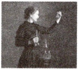 穿着一袭长裙的居里夫人十分温文尔雅,她那双深邃的大眼睛正热切地望着右手玻璃瓶中的镭,这散发着蓝色荧光的镭好似具有魔法的蓝色小精灵,深深地吸引着居里夫人的目光。