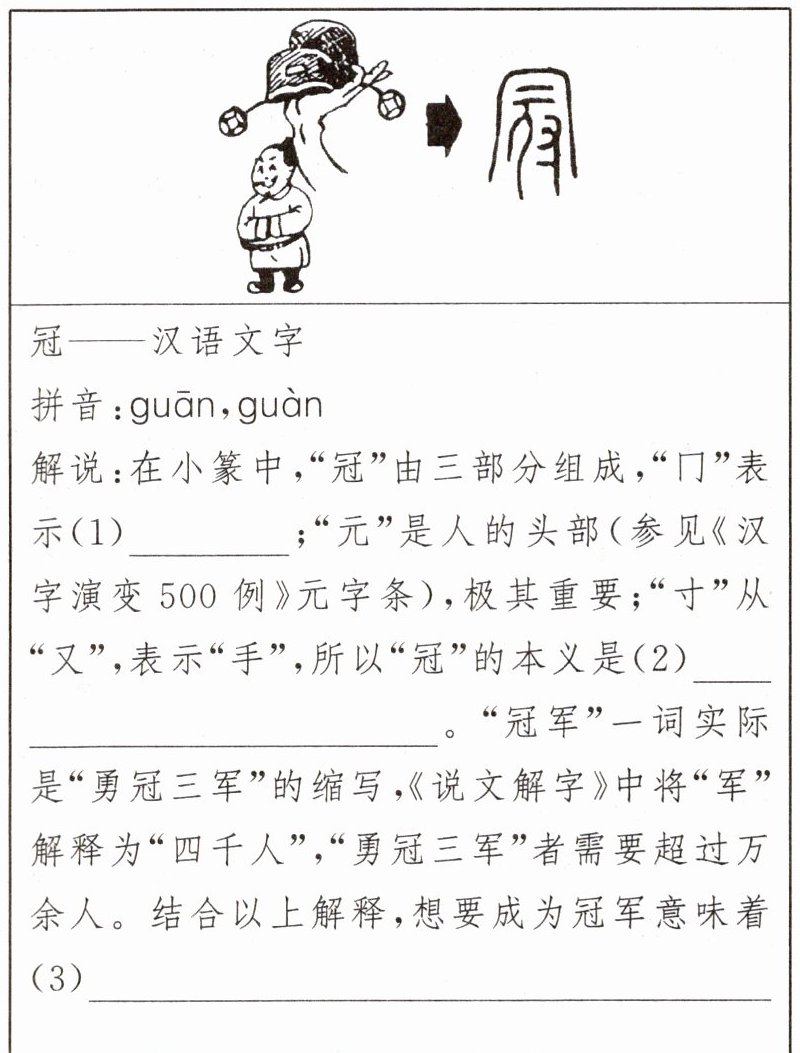 4. 在 21 年的职业生涯中,马龙曾夺得无数冠军。下面是小蒙搜集的关于“冠”字的资料,请你阅读并完成题目。