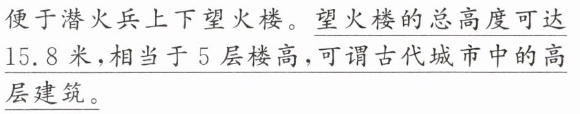 7. 望亭 支撑 卧樻 立樻 8. 运用了列数字的说明方法。(1 分)“15.8”给出望火楼的具体高度数据,准确、突出地说明了望火楼之高,使读者对其高度有一个具体、准确的认识。(2 分) 9. “主要”是“最重要的”意思,起到修饰和限制的作用(1 分),指这些朝代中只有最重要的城市设有望火楼,而不是全部城市(1 分),如果删去,原句的意思就变为所有城市都有望火楼,与事实不符(1 分),“主要”一词体现了说明文语言的准确性与严谨性(1 分)。