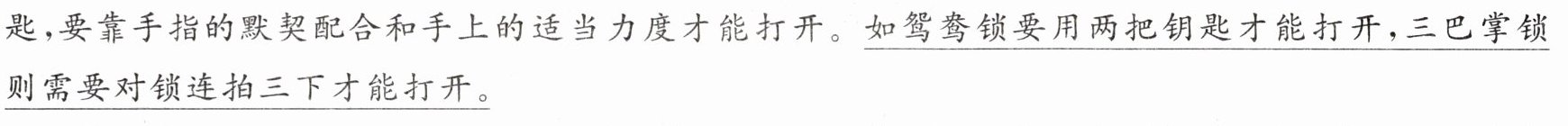 如鸳鸯锁要用两把钥匙才能打开,三巴掌锁则需要对锁连拍三下才能打开。___
