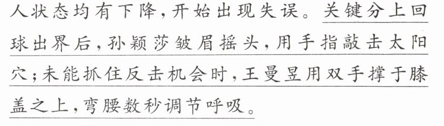 通过动作和神态描写(1分),生动形象地展现了两位运动员在面对失误时的状态,进一步营造了紧张的比赛氛围,给读者以身临其境之感(2分)。