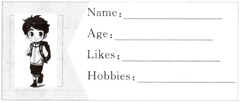 活动3: (示例) Hello, everyone. This is Li Ming. He is 13 years old. He likes apples and English. His hobbies are playing basketball and reading books. / Hello, everyone. I'm Li Ming. I'm 13. I like apples and English. My hobbies are playing basketball and reading books.