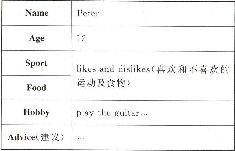 And Peter is my good friend. He is 12 years old. His favourite sport is football. He likes playing it with me every weekend. But he doesn't like playing tennis. Because he thinks it's boring. His favourite food is Chinese food, but he doesn't like Mapo tofu. He thinks it's so hot. Peter and I like music a lot. We are both in the school band. We often play the guitar together after school. I think we should be kind to others first to make a new friend. Then it's a good idea to share hobbies with each other.