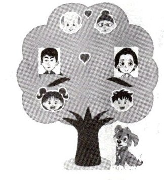 Here is my family tree. The old man and the old woman are my grandparents. They're always kind to us. The young man on the left is my father. He is very funny and he always makes us laugh. He can play the erhu very well. The woman on the right is my mother. She is beautiful. She likes gardening. Next to me is my brother, Jim. He is tall and clever. We are different but we have a lot of fun together. There is a lovely dog, and his name is Coco. We love and help each other in my family. What's your family like?