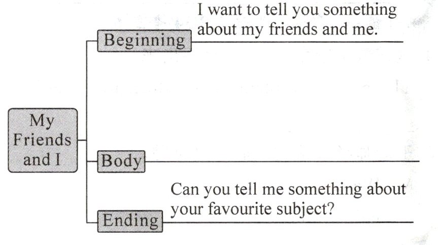One possible version: My Friends and I Hi! I'm Jane. I want to tell you something about my friends and me. Jenny and Eric are my friends. We study at the same school. I like history best, because it's fun to learn about the past. But Jenny doesn't like history. Her favourite subject is English. She thinks it's relaxing. She is good at English and she can talk with others in English. She also likes listening to English songs after class. What about Eric? Oh, science is his favourite subject because he thinks it is very useful and important. Sometimes it's difficult to remember all the information, but our science teacher Mr Wang often helps him.