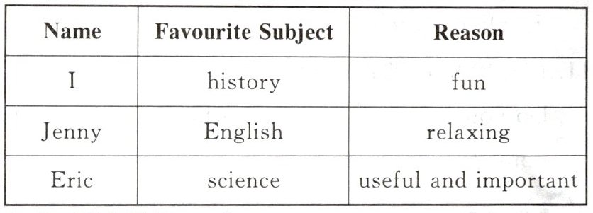 Body:①I:like history best; fun to learn about the past ②Jenny: likes English; relaxing ③Eric: likes science; useful and important
