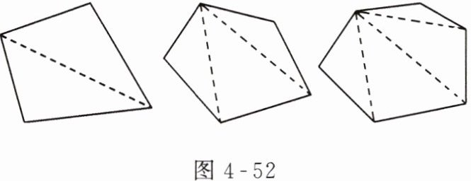 2. 如图 4-52 所示,每一个多边形都可以分割成若干个三角形. 数一数其中三角形的个数,根据此规律推测这样分割十边形能分割成______个三角形,这样分割 $ n $ 边形能分割成______个三角形.