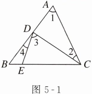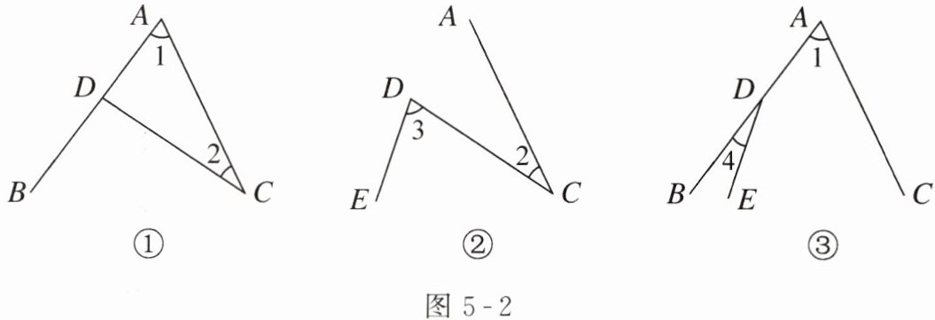 解:$ \angle 1 $ 和 $ \angle 2 $ 是同旁内角,基本图形见图 5 - 2 ①,是由直线 $ AB $ 和 $ CD $ 被直线 $ AC $ 所截构成的;$ \angle 2 $ 和 $ \angle 3 $ 是内错角,基本图形见图 5 - 2 ②,是由直线 $ AC $ 和 $ DE $ 被直线 $ CD $ 所截构成的;$ \angle 1 $ 和 $ \angle 4 $ 是同位角,基本图形见图 5 - 2 ③,是由直线 $ AC $ 和 $ DE $ 被直线 $ AB $ 所截构成的。