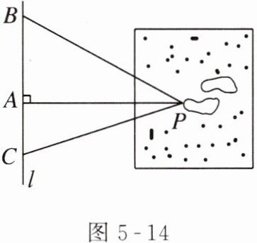 5. 如图5-14,在体育测试中,裁判员测量同学们的跳远成绩时,是测量落在沙坑中的脚印上点 $ P $ 到直线 $ l $ 上 $ A $,$ B $,$ C $ 三点中的点____的距离. 根据自己的认识指出测量方法的依据是____.