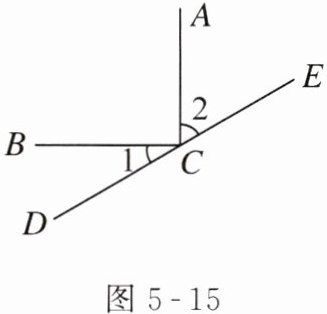 7. 如图5-15所示,已知直线 $ AC $ 与直线 $ BC $ 互相垂直,直线 $ DE $ 经过点 $ C $,如果 $ \angle 1 = 35° $,那么 $ \angle 2 $ 为……【】