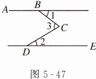2. 如图 5 - 47,如果直线 $ AB // DE $,且 $ \angle 1 = 38^{\circ} $,$ \angle 2 = 32^{\circ} $,那么 $ \angle 3 = $______。