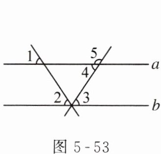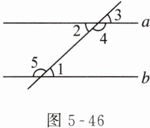 1. 如图 5 - 46,直线 $ a // b $,$ \angle 1 = 40^{\circ} $,则 $ \angle 2 = $______,$ \angle 3 = $______,$ \angle 4 = $______,$ \angle 5 = $______。