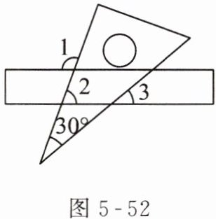7. 如图 5 - 52,把一块含有 $ 30^{\circ} $ 角的直角三角板与一把直尺按图中方式叠放。如果 $ \angle 1 = 110^{\circ} $,那么 $ \angle 2 $ 的度数是______,$ \angle 3 $ 的度数是______。