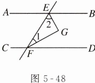 3. 如图 5 - 48,已知直线 $ AB // CD $,$ EG $ 平分 $ \angle BEF $,$ FG $ 平分 $ \angle DFE $,则图中 $ \angle 1 $ 与 $ \angle 2 $ 的关系是______。