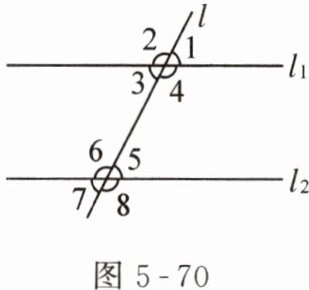 7. 如图 5 - 70,$ l_1 // l_2 $,$ l $为 $ l_1 $,$ l_2 $的截线,$ \angle 1 = 63° $,给出下列四个结论:① $ \angle 5 = 63° $;② $ \angle 3 = \angle 6 $;③ $ \angle 2 + \angle 6 = 234° $;④ $ \angle 4 + \angle 7 = 180° $.错误结论的个数是……【 】