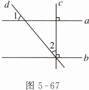 4. 如图 5 - 67,直线 $ c \perp a $,$ c \perp b $,直线 $ b $,$ c $,$ d $交于一点.若 $ \angle 1 = 50° $,则 $ \angle 2 = $______.