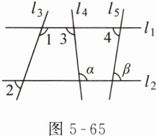 2. 如图 5 - 65,$ \angle 1 = 110° $,$ \angle 2 = 70° $,$ \angle 3 = 95° $,$ \angle 4 = 80° $,则 $ \angle \alpha = $______,$ \angle \beta = $______.