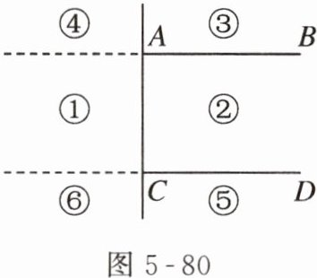(2)在(1)的问题解答过程中,发现当点 $ E $ 的位置不同时,得到的结论有相同的也有不同的,若按图 5 - 80 把平面分为 6 个区域,请你指出点 $ E $ 在哪些区域时结论相同.