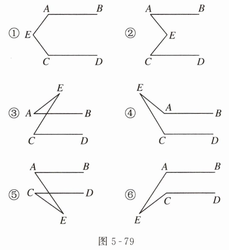 2. (1)如图 5 - 79,$ AB // CD $,分别探讨六个图形中 $ \angle AEC $ 与 $ \angle BAE $,$ \angle DCE $ 之间的数量关系. 并请你从所得的关系中任意选取两个加以证明.