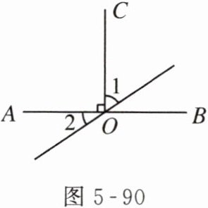 7. (德州) 如图 5 - 90,已知三条直线相交于点$O$. 如果$CO \perp AB$,$\angle 1 = 56^{\circ}$,那么$\angle 2$等于【 】