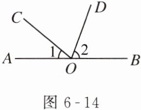 18. 如图 6 - 14,点 $ O $ 在 $ AB $ 上,$ \angle 1 = 40^{\circ} $,$ OD $ 平分 $ \angle BOC $,则 $ \angle 2 $ 是 【 】