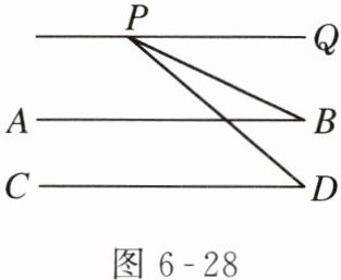 10. 如图 6 - 28,$ CD // AB // PQ $,$ \angle D = 40^{\circ} $,$ \angle B = 25^{\circ} $,则 $ \angle BPD = $______。