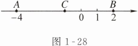 8. (福建)如图 $1 - 28$,数轴上 $A$,$B$ 两点表示的数分别是 $-4$ 和 $2$,点 $C$ 到 $A$,$B$ 两点的距离相等,则点 $C$ 表示的数是______.