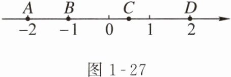 7. (漳州)如图 $1 - 27$,数轴上有 $A$,$B$,$C$,$D$ 四个点,其中表示互为相反数的点是______.