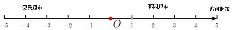 (1) 请以仓库为原点,向东为正方向,用$1个单位长度表示1km$,画出数轴,并在数轴上表示出花园超市、滨河超市、便民超市的位置.