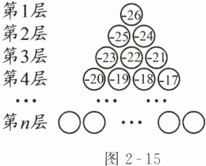 (2) 我们自上而下在每个圆圈中都按图 2-15 的方式填上一串连续的整数$-26$,$-25$,$-24$,…$$,如图 2-15 共填 10 层,求所有圆圈中各数的和,以及所有圆圈中各数的绝对值的和.