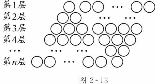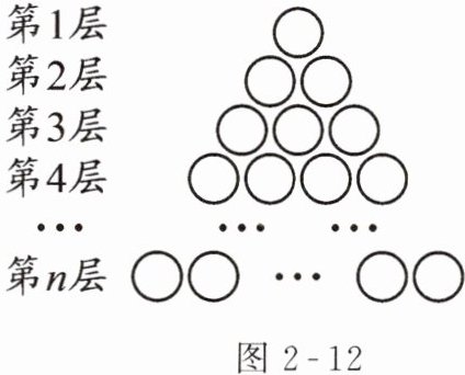 4. 图 2-12 是由若干个小圆圈排列成的一个形如正三角形的图案,最上面一层有一个圆圈,以下各层均比上一层多一个圆圈,一共堆了$n$层,共有圆圈多少个?