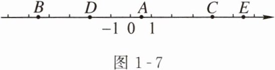 1. 如图 1-7,数轴上的点 $ A $,$ B $,$ C $,$ D $,$ E $ 表示的数分别为:$ A $:______;$ B $:______;$ C $:______;$ D $:______;$ E $:______。