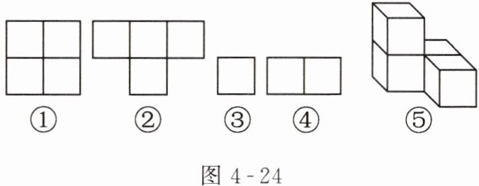 10. 图 4-24 的 ⑤ 是由 4 个小立方块搭建的几何体,试改变图 4-24 中图 ⑤ 的 4 个小立方块的搭建方式(4 个小立方块都用),使它的俯视图分别如图 4-24 的 ①、②、③、④,并画出对应的立体图形。