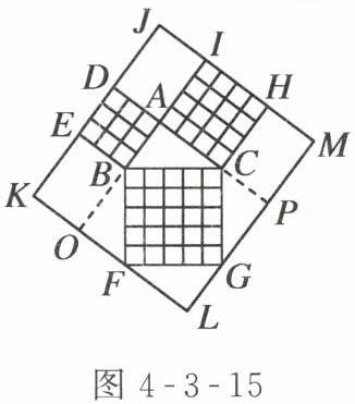 16. (宁波)(1) 问题 勾股定理是几何中的一个重要定理. 在我国古算书《周髀算经》中就有“若勾三, 股四, 则弦五”的记载. 图 4 - 3 - 14 是由边长相等的小正方形和直角三角形构成的, 可用面积关系验证勾股定理. 图 4 - 3 - 15 是由图 4 - 3 - 14 放入长方形内得到, 点 $ D,E,F,G,H,I $ 都在长方形 $ KLMJ $ 的边上, $ \angle BAC = 90^{\circ},AB = 3 $, $ AC = 4 $, 则长方形 $ KLMJ $ 的面积为______.