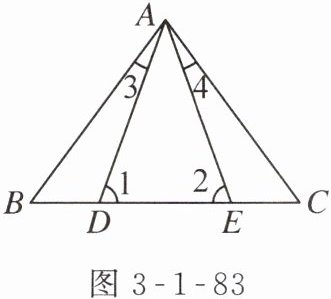 9. 如图 3 - 1 - 83,点$B$,$D$,$E$,$C$在一条直线上,$\angle 1 = \angle 2$,$\angle 3 = \angle 4$。求证:$AB = AC$。