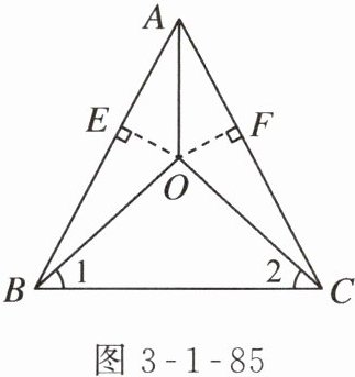 11. 如图 3 - 1 - 85,在$\triangle ABC$中,$O为\angle BAC$的平分线上一点,$\angle 1 = \angle 2$。