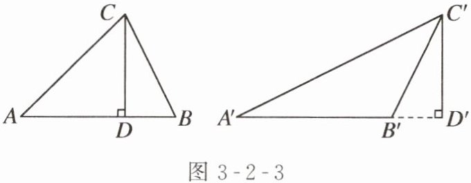 在$\triangle ABC和\triangle A'B'C'$中,已知$AB = A'B'$,$BC = B'C'$,$CD \perp AB于点D$,$C'D' \perp A'B'于点D'$。