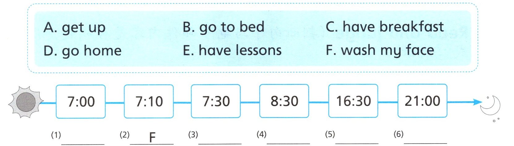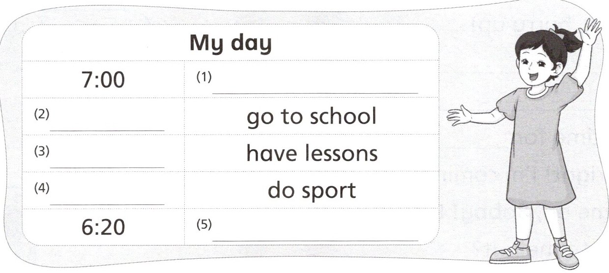 1.get up 2.8:00 3.8:30 4.4:15 5.have dinner